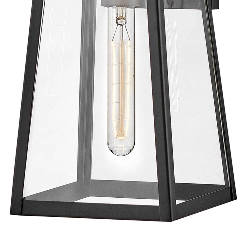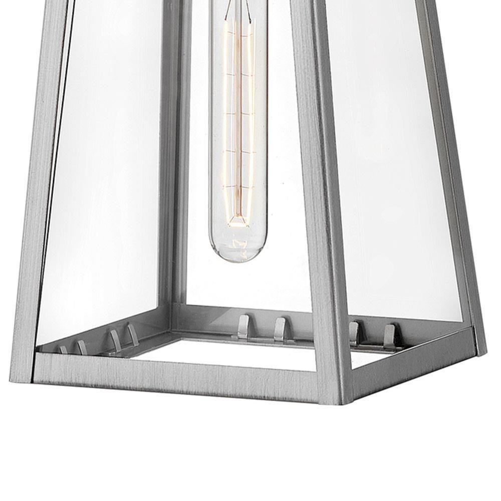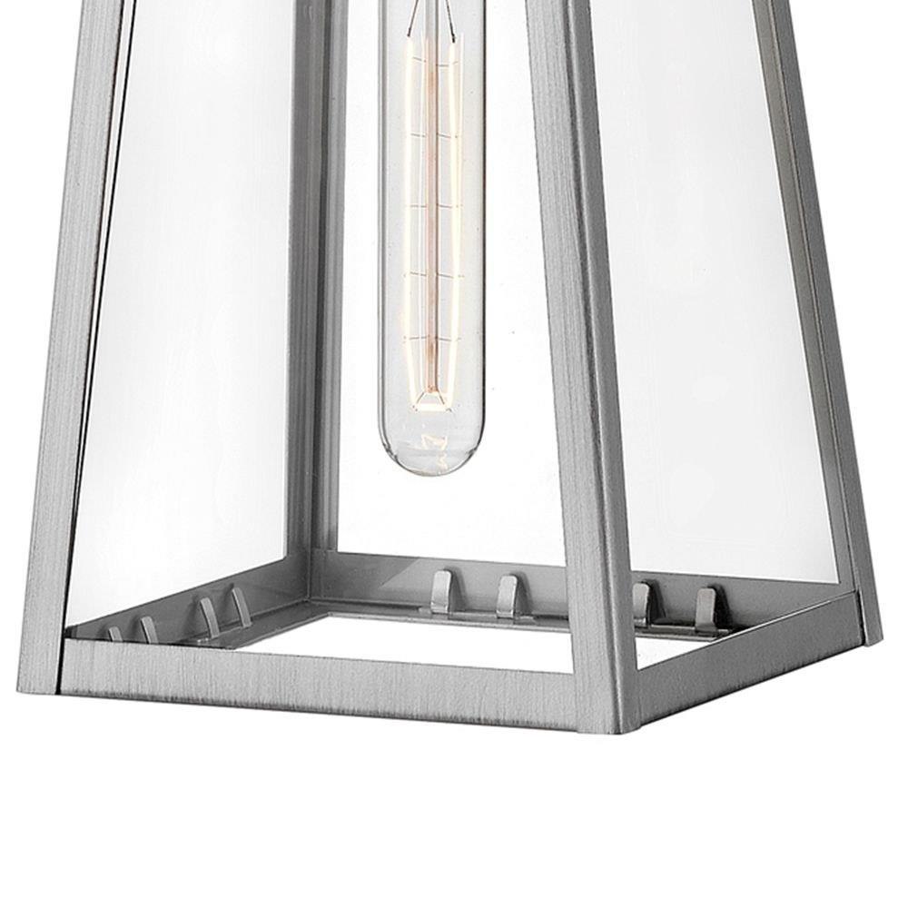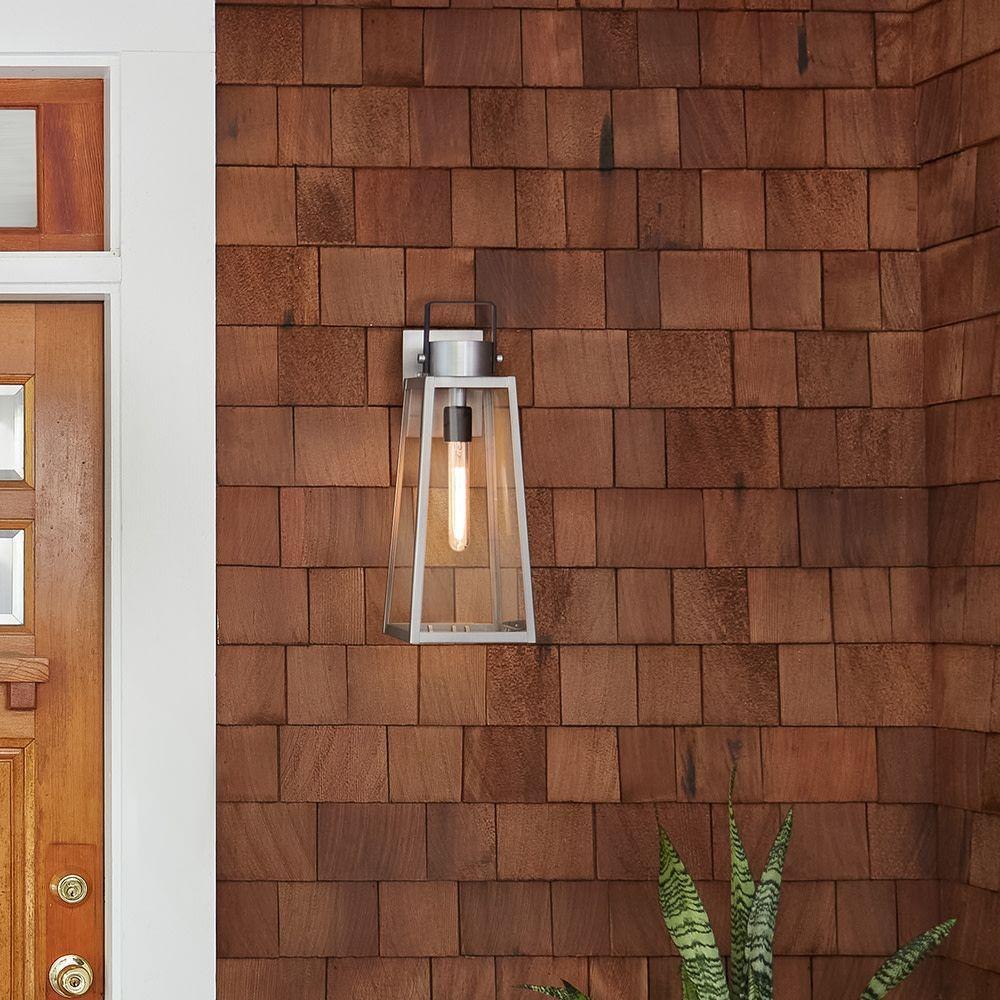 Hype up your alfresco area with the small Hugh wall-mounted outdoor lantern. Its sleek transitional 1-light design highlights the over scaled clear glass panes, framed by a luxe two-tone metal finish in classic Antique Brushed Aluminum with a matte Black accent. Pro tip: we recommend a tubular vintage filament bulb to make Hugh pop on porches, patios, or amp up any exterior space.