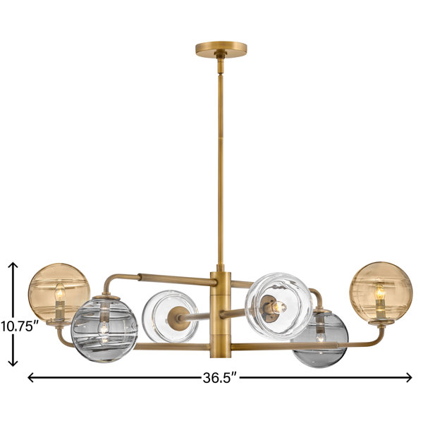 Unexpected materials and innovative technology combined to make this contemporary mobile pendant. Ribbed stems and three articulating arms in an aged, classic Black Oxide finish create a tailored, transitional silhouette. Globe-style swirled glass shades grace the ends of each arm in three complementary colors - Frosted, Smoke, and Clear. Each globe is illuminated by (1) 5w candelabra LED bulb (not included). Merging traditional Sputnik and Globe chandeliers, this modern light fixture includes (1) 6-in and (2) 12-in down stems for a customized installation height of up to 42.5 inches and can be hung on even or sloped ceilings.