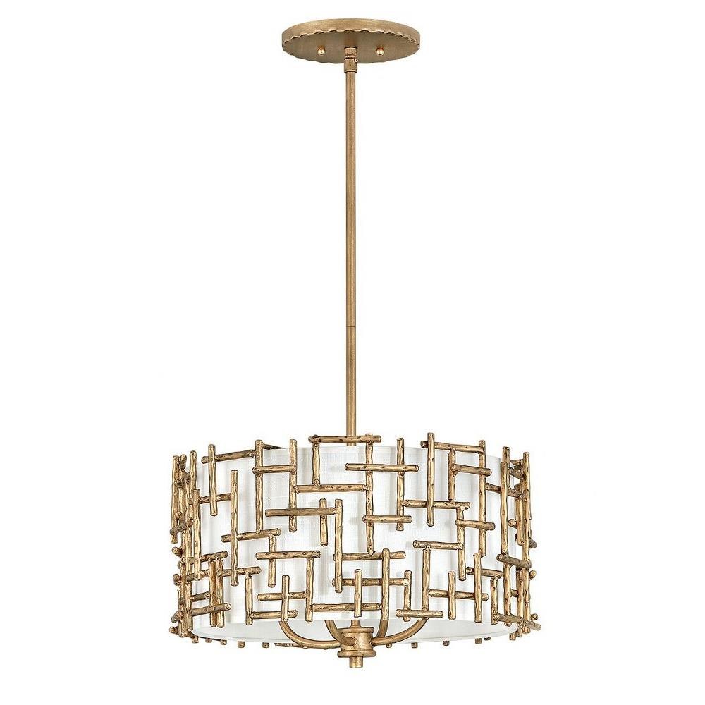 Farrah's contemporary design is bold and sculptural, while achieving an optical airiness. The hand-hammered crosshatch bars gleam in a hand-applied Silver Leaf or Burnished Gold finish with artisanal detailing that carries through to the canopy detail. Set against a White Linen shade, Farrah creates a look of deconstructed, modern elegance. This stem hung fixture may be hung on a sloped ceiling. This fixture includes multiple down stems in various lengths to customize the installation height of the fixture, including one 6" stem and two 12" stems. Fixture mounts directly to canopy or with a fixture specific stem that is less than 6" Suitable for use in dry (indoor) locations as defined by NEC and CEC. Meets United States UL Underwriters Laboratories & CSA Canadian Standards Association Product Safety Standards Merging the best of traditional and modern elements, with a sophisticated and streamlined silhouette perfect for any space Luxurious gold finish with opulent sheen.