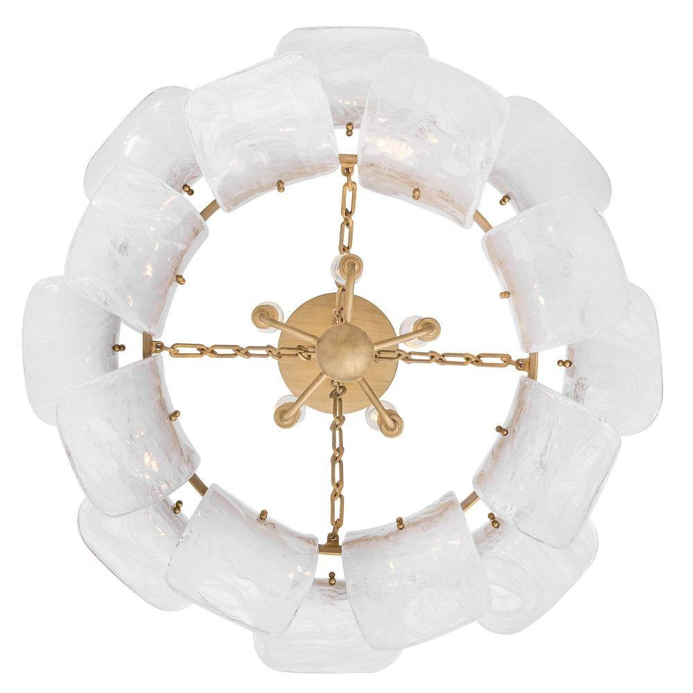 Deftly slumped and artfully arranged sheets of swirled glass appear to unfurl from Fleur’s beautiful drum silhouette, complemented by a central band hand-painted in Burnished Gold. White, cloud-like layers softly diffuse inviting illumination from warm candelabra lamps, creating an enchanting atmosphere.