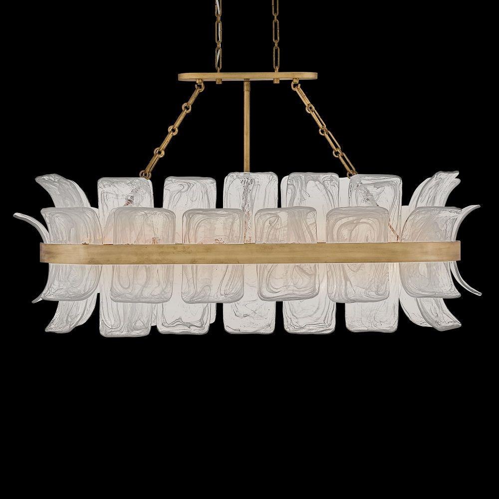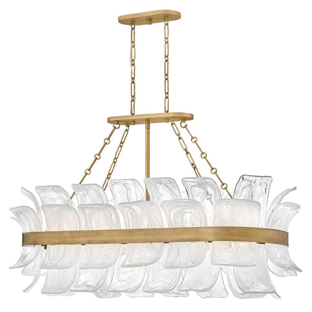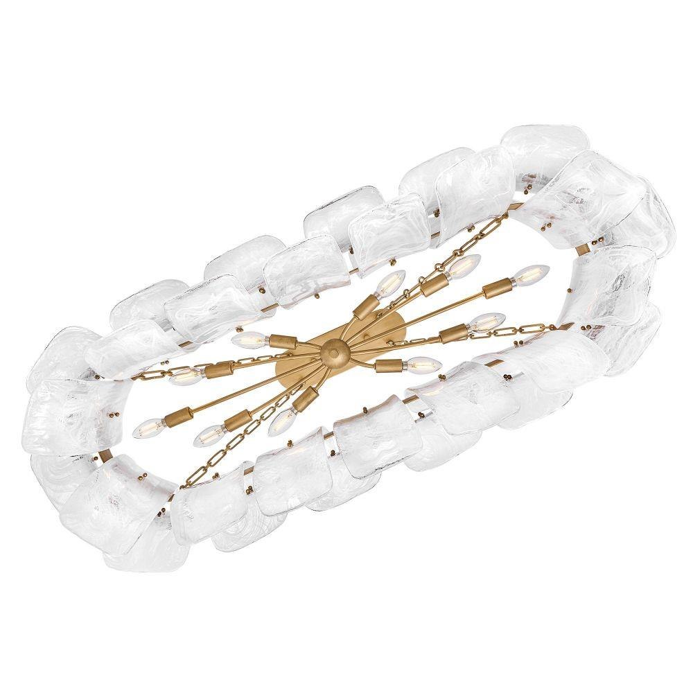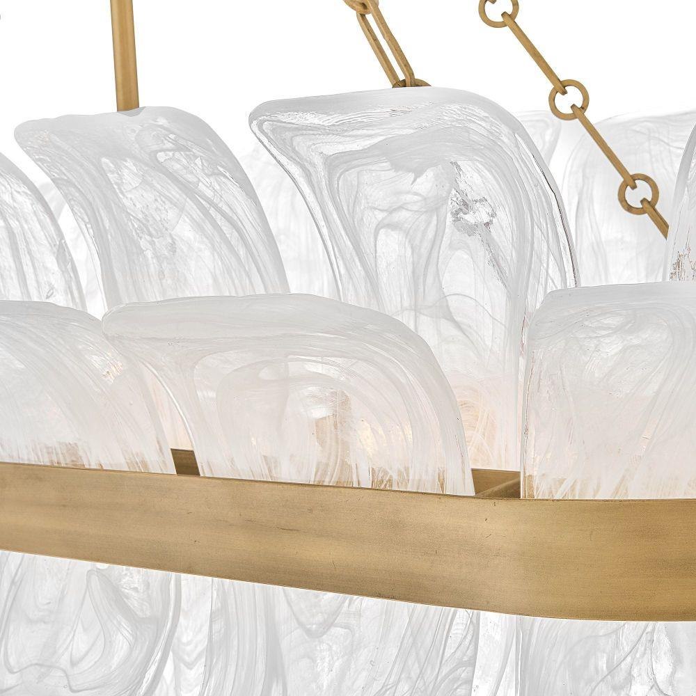 Deftly slumped and artfully arranged sheets of swirled glass appear to unfurl from Fleur’s beautiful drum silhouette, complemented by a central band hand-painted in Burnished Gold. White, cloud-like layers softly diffuse inviting illumination from warm candelabra lamps, creating an enchanting atmosphere.