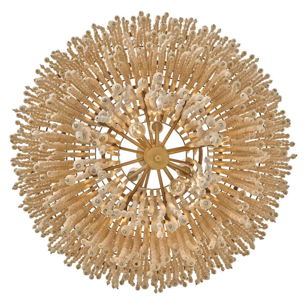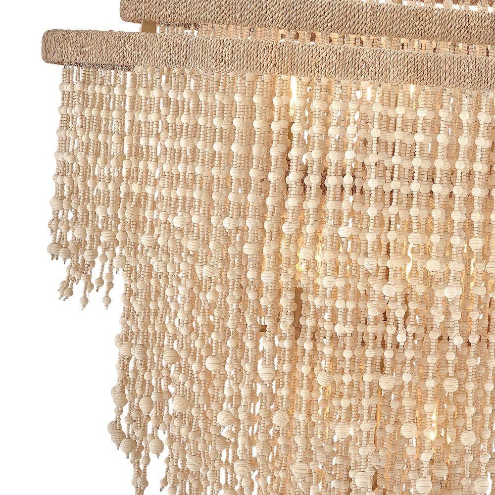 Juxtaposing unconventional materials and naturally inspired detailing with the timelessness of traditional tiered chandeliers, Freya’s cascading shade is draped with intricate beadwork. Individual strands of wooden beads are hung from hand-painted Burnished Gold frames to form bohemian curtains that cast beautiful shadows from warm candelabra lamps.