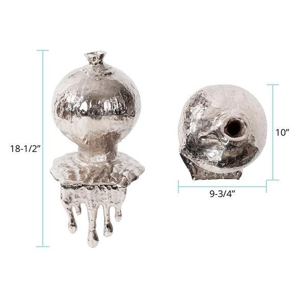 This contemporary vase creates the illusion of metal dripping down the edge of the surface it is placed on. Aluminum is fashioned into an organically spherical shape and is finished in a metallic nickel, further enhancing its melting effect. The molten effect will surely be a conversation starter for years to come! Pair with the coordinating pieces in the collection for a complete look. Opening 1