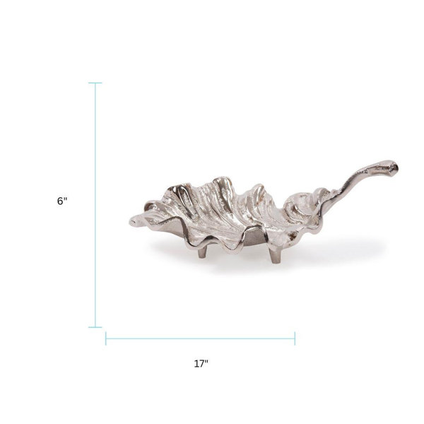 The cast aluminum leaves are finished in polished silver, giving the tray a luxurious and reflective surface. This finish enhances the tray's aesthetic appeal, making it an eye-catching centerpiece or functional display piece for candies or nuts.