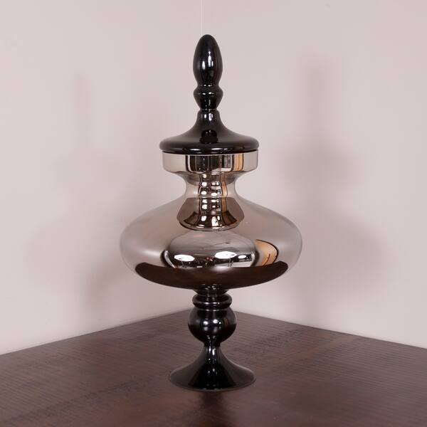 This urn is fashioned from expertly hand blown glass. The wide shaped body is finished in a striking metallic silver with a smoky effect. The flared base and matching lid is finished in black. Pair with the smaller size to complete the set. Console tables, book shelves, pedestals or any other place that an accent is needed, are the perfect places for this vase