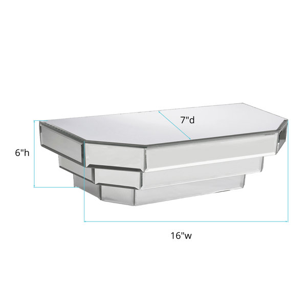 This floating shelf is a contemporary piece featuring stepped mirrored layers. Each mirrored panel is beveled adding to its style and beauty. Because it is mirrored, it beautifully displays and reflects each piece you put on it like a showcase for art. The shelf is a perfect accent piece for an entryway, bathroom, bedroom or any room in your home. Hardware is affixed to the back of the shelf so it is ready to hang right out of the box.