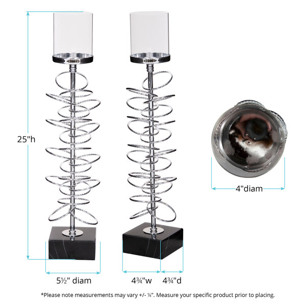 Our ring toss candle holder features iron rings encircling a central rod. The entire piece is finished in silver metallic chrome and is set on a black marble base. A glass hurricane cover is included to keep the flame of your candle from blowing out. Fits up to a 3.7/8 pillar candle (not included). Pair with the additional sizes in the collection for a complete look.