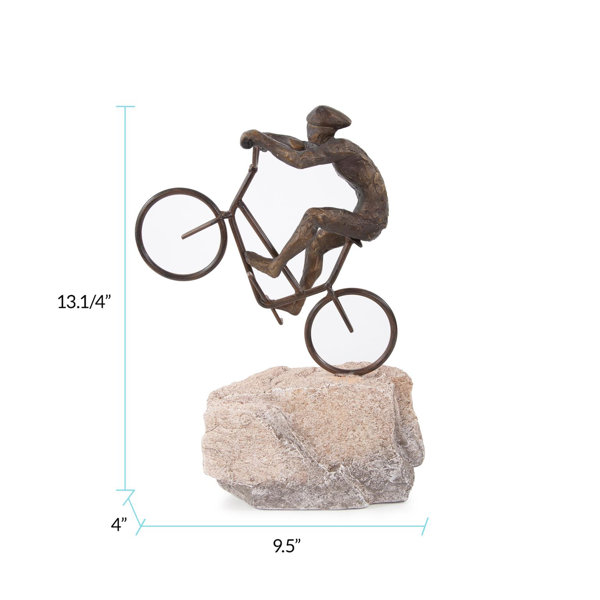 The cyclist shows off the daredevil in all of us as he pops a wheely. Cast in resin and finished in bronze the cyclist is perched on sculpted rock formation.