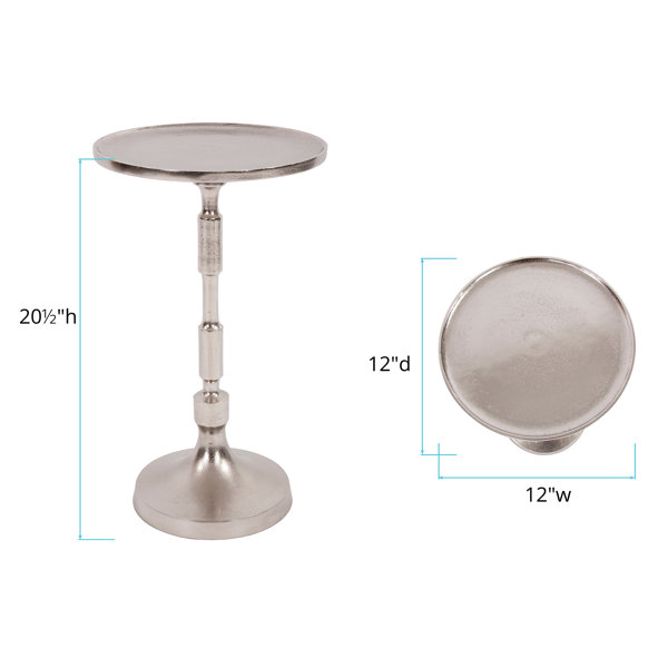 Small in stature but major in style, this end table adds a glam accent next to your sofa or reading nook. It's made from aluminum in a brushed nickel finish for just the right amount of shine. The pedestal base has turned details for a classic look. The tabletop has a raised tray edge that helps to prevent things from rolling off. This side table measures 20.5" tall and 12" wide, so it can stand up to your sofa while fitting in smaller spaces.