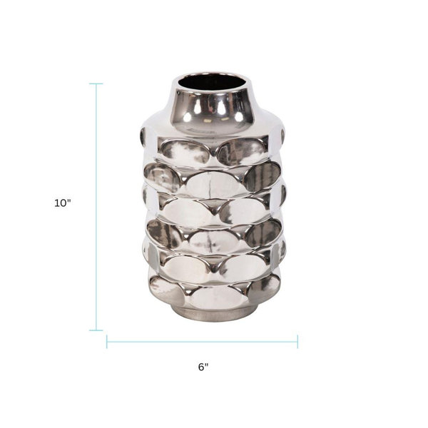 The interesting geometric texture of this vase is inspired by vintage tiled roofs. The tall cylindrical vase fashioned from ceramic decorated with this unique texture surrounding the piece. It is finished in an electrostatic metallic silver finish that transports it into the modern, high design.