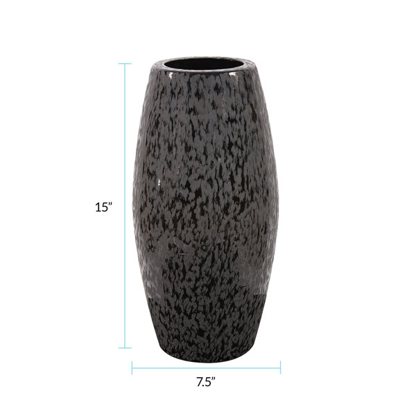 This interesting vase features a glossy black, cylindrical shape formed from iron. What makes it unique, is the chiseled texture characterizing the exterior, creating an intriguing 2 toned effect. Pair with the coordinating pieces of the collection to complete the look.