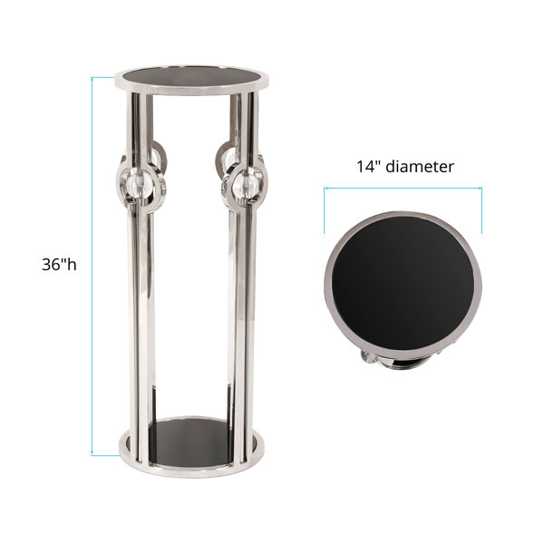 This sleek pedestal features a stainless steel bar frame. Each leg is accented with a circular detail and affixed in the center of each is a clear, round acrylic ball. The top and bottom surfaces are black tempered glass. The simple design of this table lends itself to any décor style. Perfect for any room or space to add character. Add it to your entryway, hallway, living room, or any place you need a table.