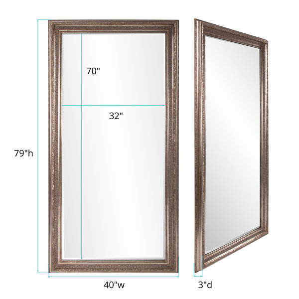 This full-length mirror adds a glamorous, traditional accent to your bedroom or entryway walls. It features a wooden frame that is decorated with an intricate design and is finished with a champagne silver leaf color for a hint of glimmer. The mirrored panel has a beveled edge for an added touch of embellishment. It measures 79'' tall and 40'' wide, so you can glimpse your whole reflection without missing a spot. Included installation hardware makes it easy to install vertically or horizontally. You can even lean it against your wall for more of a more relaxed look.