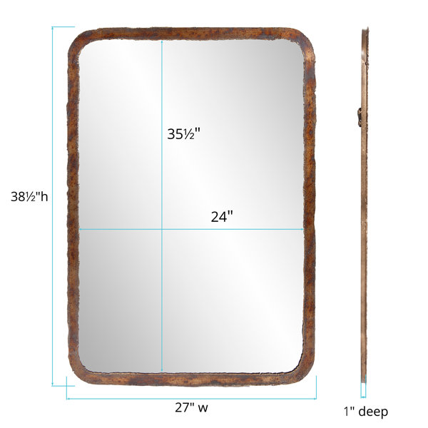 This wall mirror adds some rustic charm to your home thanks to the frame's brown hue that looks almost like wood. It has a rectangular metal frame with an acid-washed finish and a torn edge effect for a hint of industrial style. The mirror itself has a beveled edge for added dimension. At 38.5" tall and 27" wide, this accent mirror looks great in your living room or bedroom. D-rings affixed to the back make it ready to hang right out of the box.