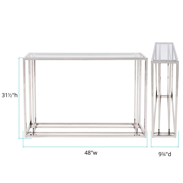 Parallel lines of polished stainless steel echo each other in the simple design of our Echo Console Table. The Console Table features linear rods of polished stainless steel. The frame holds a clear tempered glass top. The collection also includes a tall pedestal table, sold separately. Pair them together to complete the look.