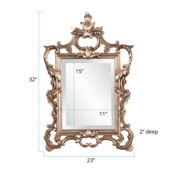 Looking to elevate your aesthetic? You might as well go for Baroque! A perfect pick, this mirror steals looks and reflects them in an ornate style. Its resin frame, measuring 32'' tall, boasts Baroque-inspired scroll details with a crowned top, all awash in an antiqued champagne silver leaf finish. The mirrored glass features a beveled edge that adds a little extra dimension to its look. Plus, hanging hardware is included for headache-free installation.