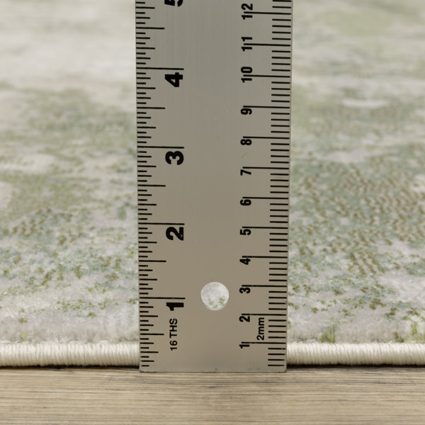 This indoor area rug features a mix of high and low piles for a textured appearance while showcasing an abstract, organic pattern of moss green, dark charcoal, light grey, and beige tones. It's power-loomed using 100% stain-resistant polyester fabric, and it's made to look distressed for a well-worn, vintage-inspired yet contemporary look. The highest pile height is 0.31", so it allows for a variety of placement options in your home including your living room, entryway, or sunroom. It's also safe to place on heated floors. We recommend getting a rug pad to fit beneath this rug to keep it from shifting underfoot.