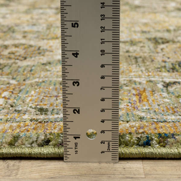 This Oriental rug brings bold boho style to any room in your home. It features intricate floral and botanical motifs and an eye-catching border in distinctively faded hues ranging from green and gold to brown and light blue. Machine-woven from stain-resistant polypropylene, this indoor area rug's 0.55" pile provides ample cushioning underfoot in living rooms and bedrooms. To keep it from slipping and sliding around, we recommend rolling it out over a rug pad (sold separately).