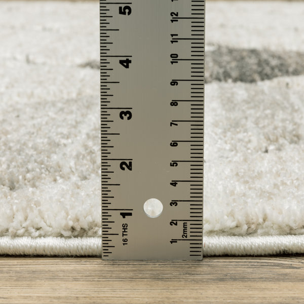 This eye-catching area rug features warm tonal neutral colors as well as subtle hues of pale blue and mint. It is power-loomed of super soft polypropylene. The dense, high-pile construction is carved, lending visual and tactile appeal to the soft modern design.