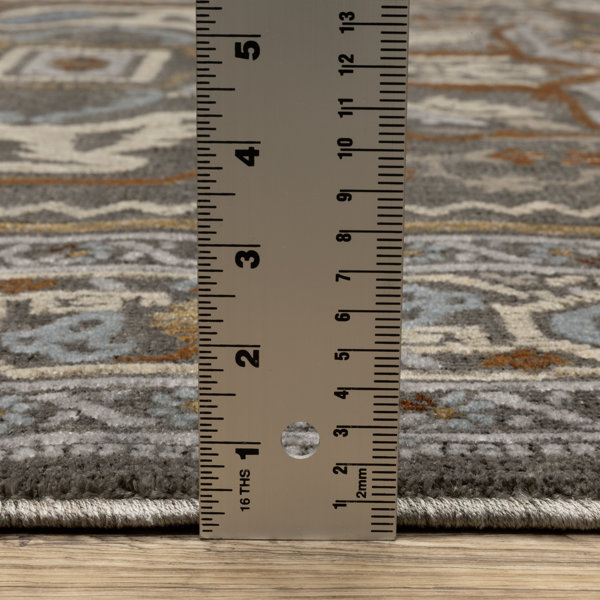 Rug color include shades of gray, blue, rust, beige, gold, ivory