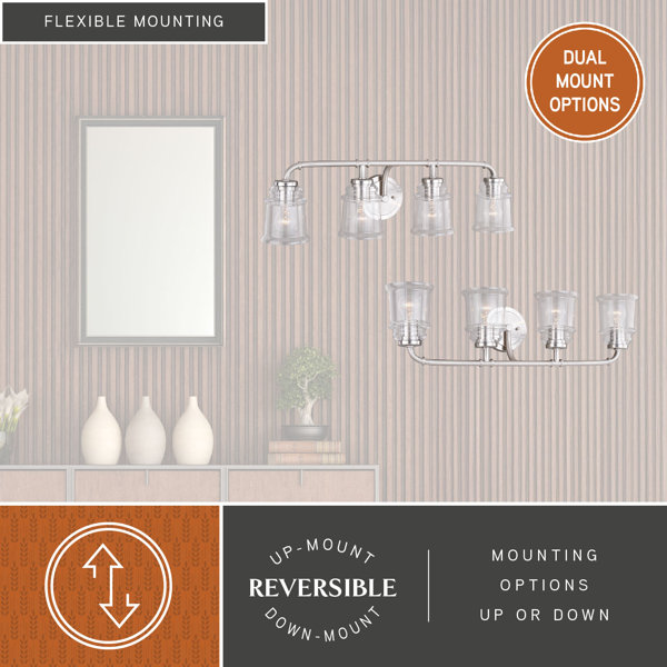 Coastal style meets a modern feel in this 4-light vanity fixture. Crafted from steel, it features a pipe-inspired arm with curved corners and a nautical feel, with a bent arm and simple sconces. The sconces are wrapped with clear glass bell shades, and the sockets suit standard bulbs of up to 60W (sold separately). This fixture hangs from a circular backplate and reversible mounting options, and it's suitable for damp locations that see indirect moisture exposure. Best of all, it's compatible with a dimmer switch, letting you set the mood.