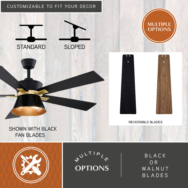 Mid-century modern meets contemporary elegance with the striking bowtie design of the Scottsdale 52-in. ceiling fan. Reversible blades in black or walnut offer versatile styling complemented by black and gold two-tone housing finishes. Ideal for indoor spaces such as living rooms, bedrooms, or kitchens and is compatible with sloped ceilings. Remote control, dimmable LED bulbs, and three-speeds for setting your ultimate comfort.