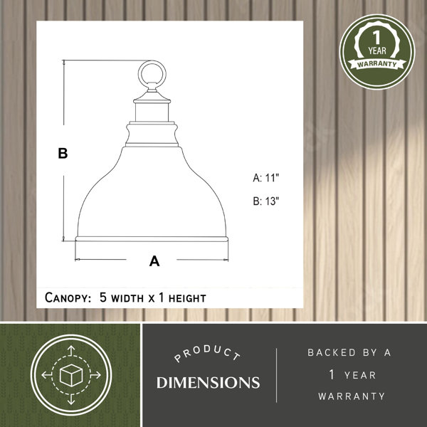 This outdoor pendant light has clean, straightforward lines and a dark, oiled bronze finish that make it our pick for adding a rustic touch to your covered porch or deck. It's crafted from steel for a reliable build that holds up in damp locations with indirect water exposure. It features a bell shade that hangs from a matching dark metal chain, with a gold-finish interior that gives the light a warm glow. This outdoor hanging light takes one standard, medium-base bulb up to 100W (sold separately). Plus, you can adjust the chain height so it fits right into your space.