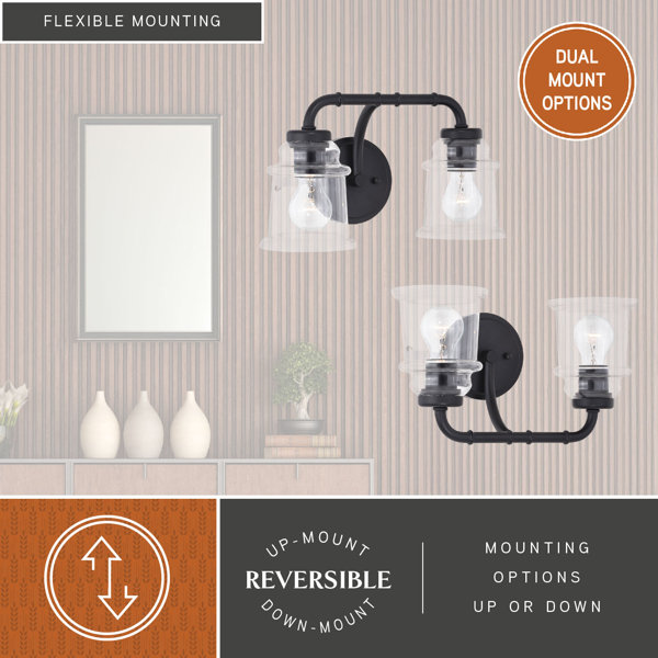 Notes of industrial and farmhouse traditions are defined by the sheen of natural brass; matte black or satin nickel and elegance of clear blown glass. Combine that with a vintage Edison-style filament bulb to complete the look. The versatile reversible mounting option lets you install this fixture up or down. This bathroom light is perfect over small vanities or as a pair over double sinks.