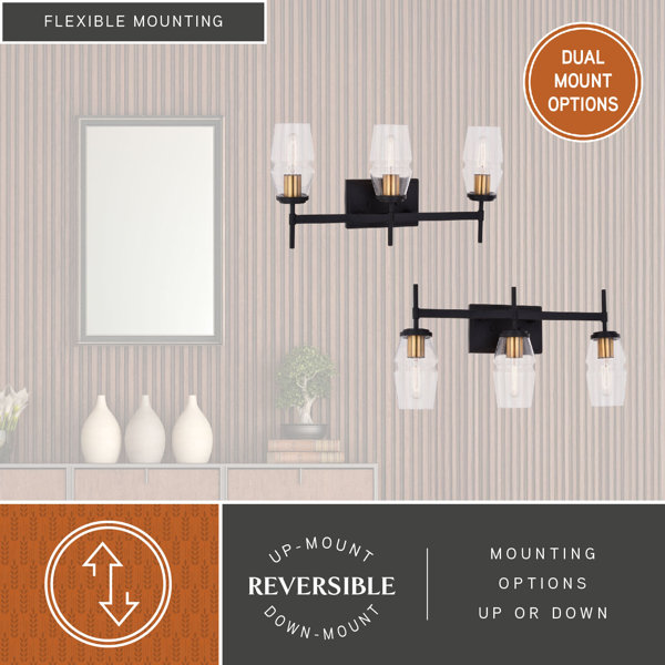 Flatter your reflection every morning with this bathroom vanity fixture. Crafted from stainless steel with a black and bronze finish, it features a streamlined, modern design with coastal details that we love. A slim bar and a rectangular backplate support three minimalist sconces, each one wrapped in a contoured, clear glass chimney shade reminiscent of an old-fashioned oil lamp. Inside, the sockets suit three standard bulbs of up to 60W (sold separately). This fixture is rated safe for damp locations, and it's dimmable, letting you choose the right lighting level to fit your mood.
