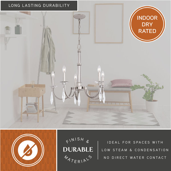 The Haverhill collection offers a contemporary update to a traditional style. Candelabra lamping finished in sleek polished nickel accented with delicate crystal drops give the Haverhill its dramatic appeal. The central column and candle holders are also ensconced in sparkling clear crystal. This stunning chandelier is ideal for kitchens, dining areas, and foyers.