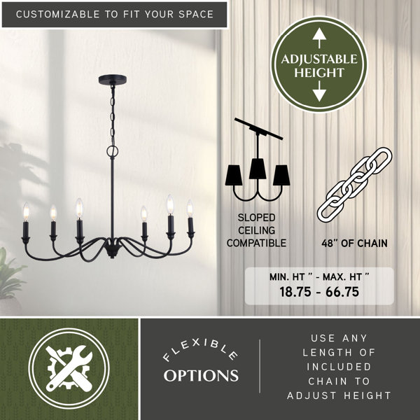 This 6-light chandelier makes a big statement in the dining room or entryway with its sweeping, curved arms and brass holders. It's crafted from steel and it hangs from an adjustable chain and a round canopy that's compatible with sloped ceilings. We love how the clean-lined look of this piece works well with aesthetics from French country to traditional. The open candelabra showcases tapered catchers that each accommodate a single candle bulb up to 60W (sold separately). Plus, this chandelier works well with a dimmer switch, allowing you to easily adjust the lighting from breakfast to happy hour.