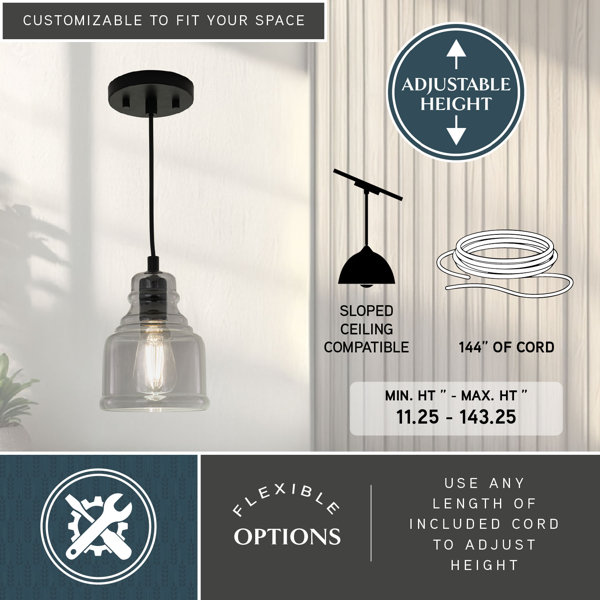 Beautiful smoke glass adds a refreshing touch to the simple matte black finish in the Casitas collection. Offered in two shapes, whether alone or in a grouping, this mini pendant is sure to add character to your kitchen or entertaining spaces. Ideal for kitchens, dining, or bar areas. Designed with a black cord that is suitable for sloped ceilings. Combine with a vintage Edison style filament bulb to complete the look.
