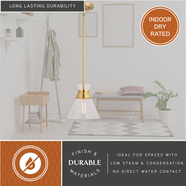 Indulge in mid-century modern charm with the Tekeira 1 Light Pendant. Its sleek, bowtie-inspired design and natural brass finish bring a touch of warmth and sophistication to your kitchen island or eat-in space. The clear glass shade beautifully showcases your choice of bulb, creating a captivating focal point.