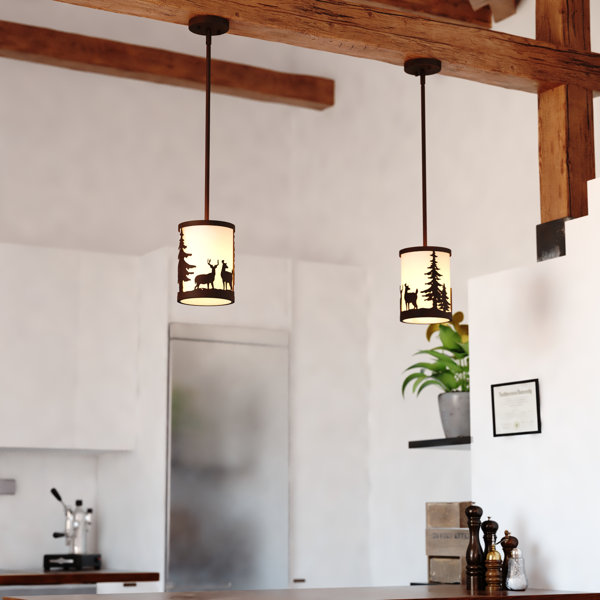 Embrace the serene whispers of the artfully crafted Jorene mini pendant to bring the essence of the wild into your home. The Jorene pendant's textured linen shade showcases bear and deer silhouettes set against a backdrop of evergreen trees. Perfect for kitchens or family rooms of cabins, lodges, or any home seeking to add a touch of nature and rustic ambiance.