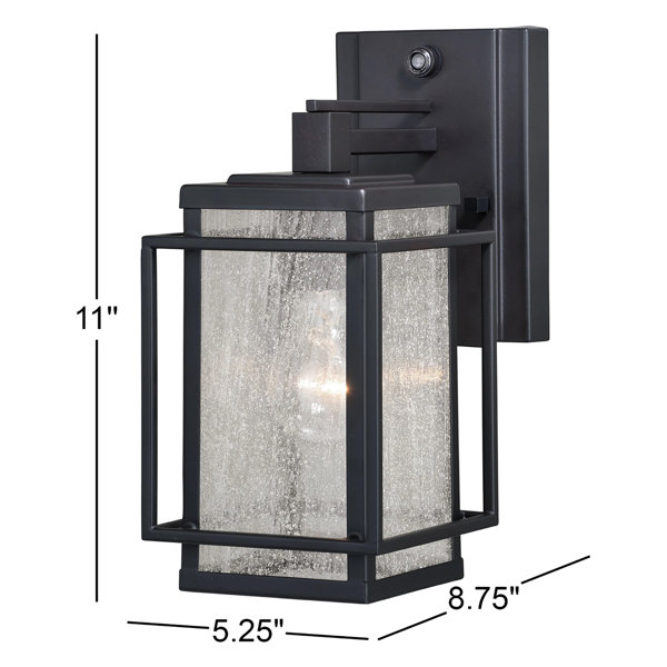 This 1-light wall lantern casts light all around your front entrance or back porch while anchoring it with a clean-lined, modern look. The frame is crafted from steel with a matte black finish, and it hangs from a tapered backplate. A sleek arm holds onto the rectangular shade, which is accented with seeded glass panels and an open square cage design for a hint of visual interest in your space. This lantern shines ambient light all over your front yard from a single bulb up to 60W (not included). We also love how it has a dusk-to-dawn sensor that turns on at the start of the day and off at night.