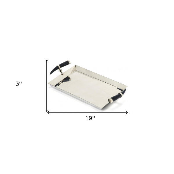 This 19-inch silver and black stainless steel and horn serving tray will add a beautiful decorative accent to your decor. This gorgeous rectangular serving tray is crafted of sleek and shiny stainless steel and includes black genuine horn handles that add an elegantly chic yet practical touch. The modern design blends metal and horn to enhance the elegance of your gatherings, while the rectangular shape provides ample space for serving drinks and appetizers. Perfect for entertaining or as a chic display piece, this tray elevates any occasion with its stylish appeal. 3-inch h x 19-inch w x 10.5-inch d.