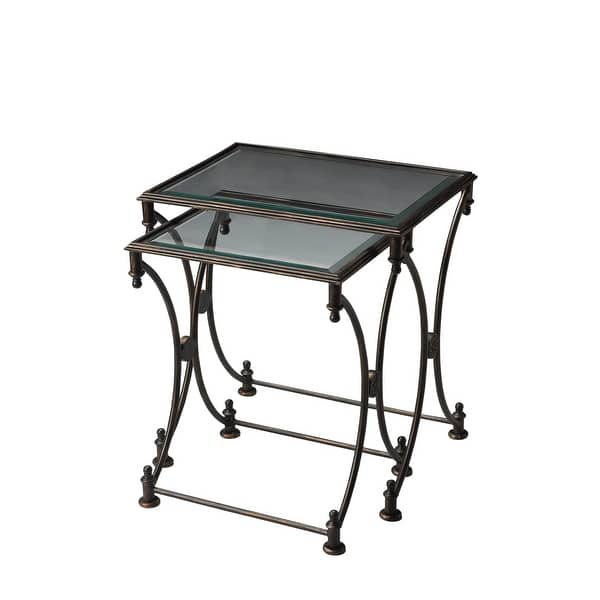 Expand your table area when needed with the nesting design of these two tables. Iron forms a rich, strong frame, and the clear glass top creates an open, airy feeling on these durable tables.