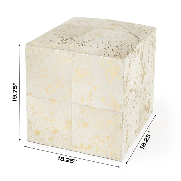This hair-on-hide leather ottoman is a glamorous, refined addition in the living room, office, or wherever extra seating is needed. Crafted from a mango wood frame, its modern design features double-stitched white hair-on-hide leather with gold leaf accents. Use this ottoman individually or group it in multiples in place of a coffee table.