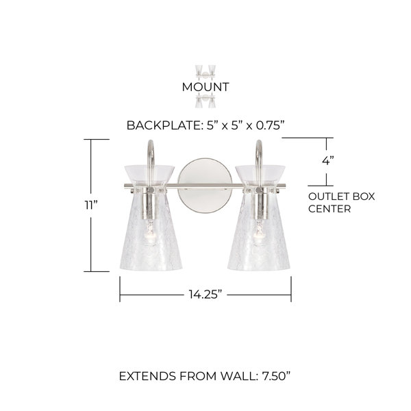 The unique half-crackle glass detail of the Mila 2-Light Vanity creates a one-of-a-kind visual texture. The Aged Brass finish and the tapered silhouette brings a sleek, sophisticated style. Also available in a 3-Light.