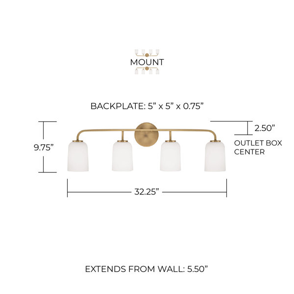 Curved lines and a mix of materials highlight this classic 4-light vanity fixture. Rated for damp locations, this piece has a circular backplate and a sleek horizontal arm that is crafted from metal, and it comes in your choice of shiny finish that complements aesthetics from French country to coastal. Four white frosted glass shades that hang from the arm shine the light up or down in your main or guest bathroom from single bulbs up to 100W, which are sold separately. Plus, this vanity light is dimmable to get the lighting you want throughout the day.