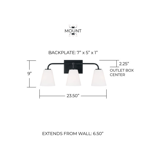 Dimensions: Overall: 23.5"W x 9"H x 6.5"E; Backplate: 7"W x 5"H x 1"E.
