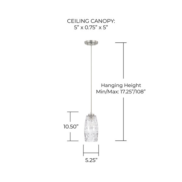 This petite 1-light pendant illuminates your space with a mix of glam materials. It's crafted from iron with a sloped ceiling-adaptable canopy and a height-adjustable bar downrod, all in a gleaming gold hue. The design features a minimalist sconce surrounded by an elegant cylindrical glass shade made of seeded glass – we love the texture that artfully filters the ambient glow. This pendant light takes one candelabra bulb, which is sold separately. Its modest size makes it great for a small entryway or pantry.