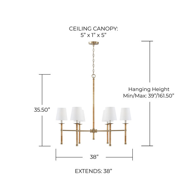 Angled shades create the ultimate sophistication with the chandelier. The crisp white fabric drum shades get a geometric refresh and complement the warmth of the slender aged brass arms.