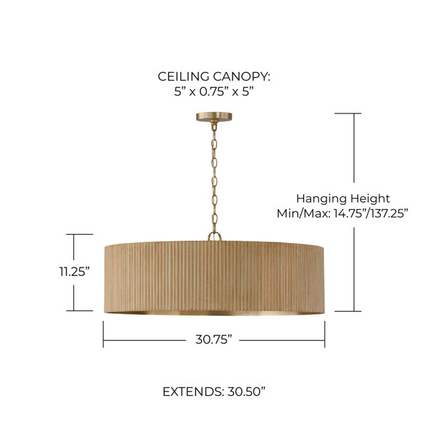 Dimensions: 30.75"W x 11.25"H; adjustable hanging height: 14.75" - 137.25"; includes 120" chain; 180" wire.