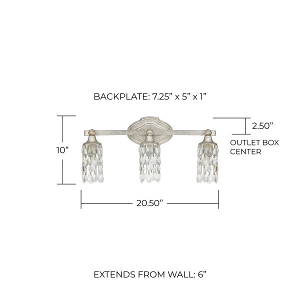 This three-light vanity light illuminates your bathroom in glamorous French country style! It's crafted from metal in a distressed antiqued finish, and it showcases a quatrefoil-inspired backplate accented by elegant moldings. Suspended from a single horizontal arm, three bell-shaped shades are attached that are draped with strings of detailed glass crystals for a hint of glam. Each shade holds one medium-base bulb up to 60W (not included) to diffuse bright light as it’s dispersed throughout your bathroom. Plus, we love that its dimmable compatibility lets you add a boost of brightness to your morning and evening skincare routine. Hand-curated by Kelly Clarkson.