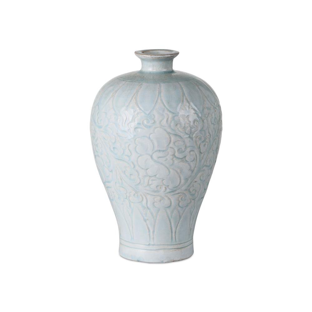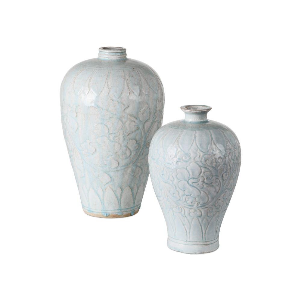 The Nanjing Celadon Vase Set is a beautifully crafted duo that reflects the rich tradition of Chinese ceramic artistry. This set includes an urn vase and a plum vase, both finished in a pale celadon glaze. Delicate cloud and lotus motifs swirl gracefully across the vases, adding texture and symbolism that evoke purity and harmony. The pair is modeled after ritual bottles from the Ming dynasty.