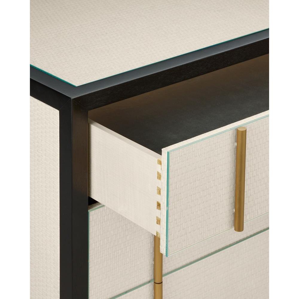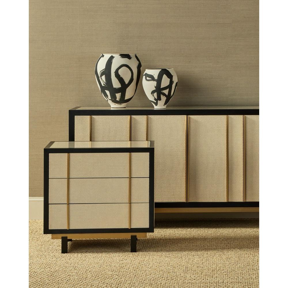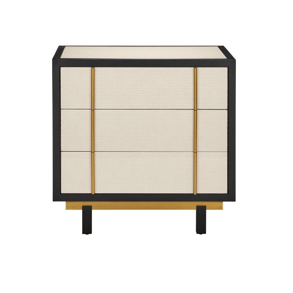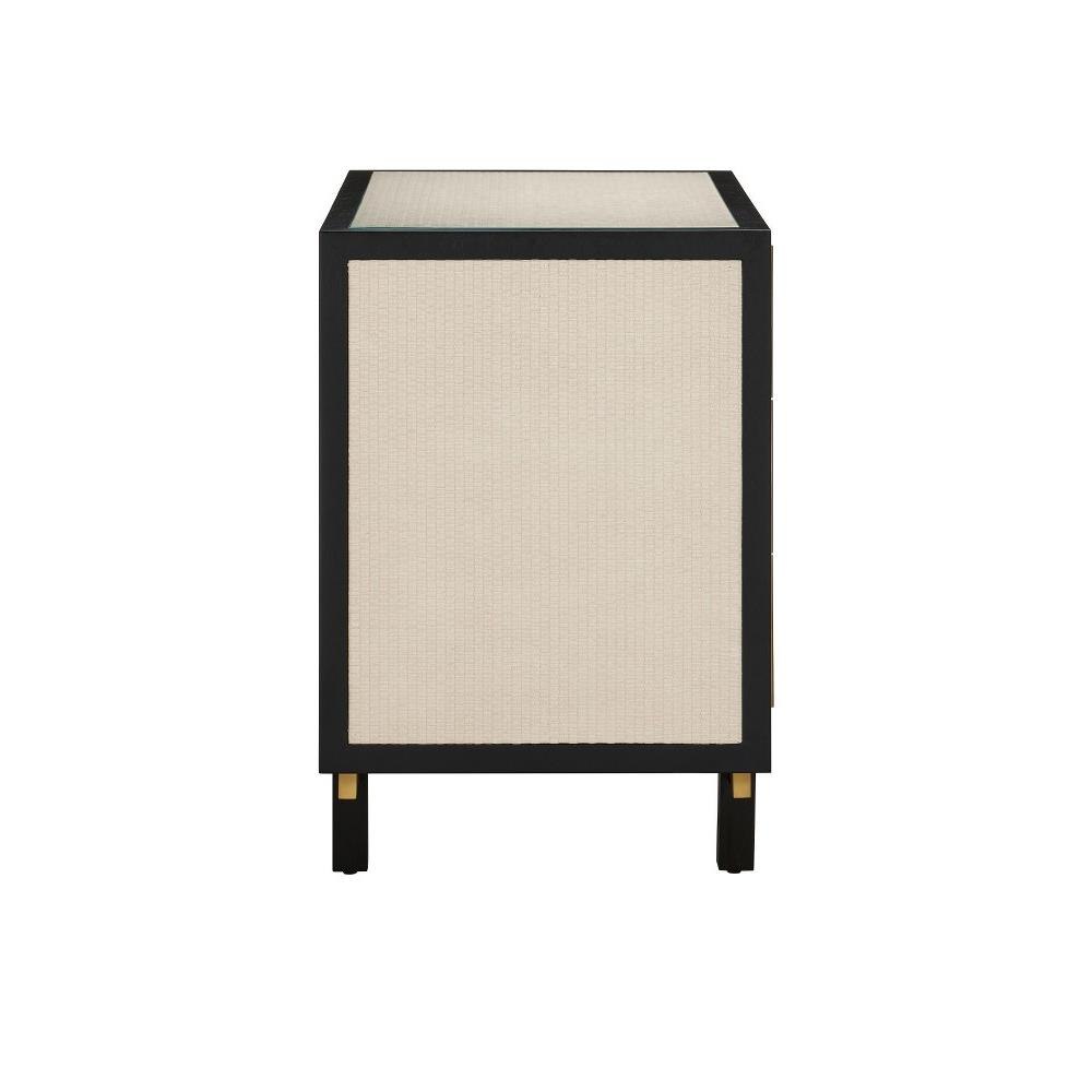 The Deanna Raffia Nightstand has panels of woven raffia on its drawer-fronts, sides, and top that are surrounded by strips of Okoume wood in a black finish, matching the nightstand’s legs. The combination of black and beige bring this piece a tailored feel that fits within a wide spectrum of design styles, especially a room that exudes Hollywood glamour. The subtle texture of the raffia is a special aspect of this design, as is the fact the nightstand is fitted with an inset glass top to protect the natural fibers. Linear drawer pulls and a plinth base are made of metal in a brushed brass finish to bring elegance to the piece.