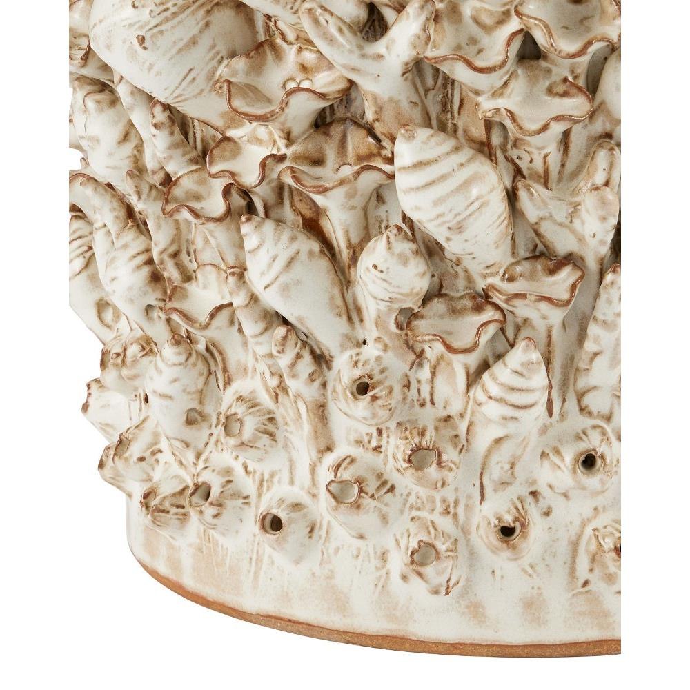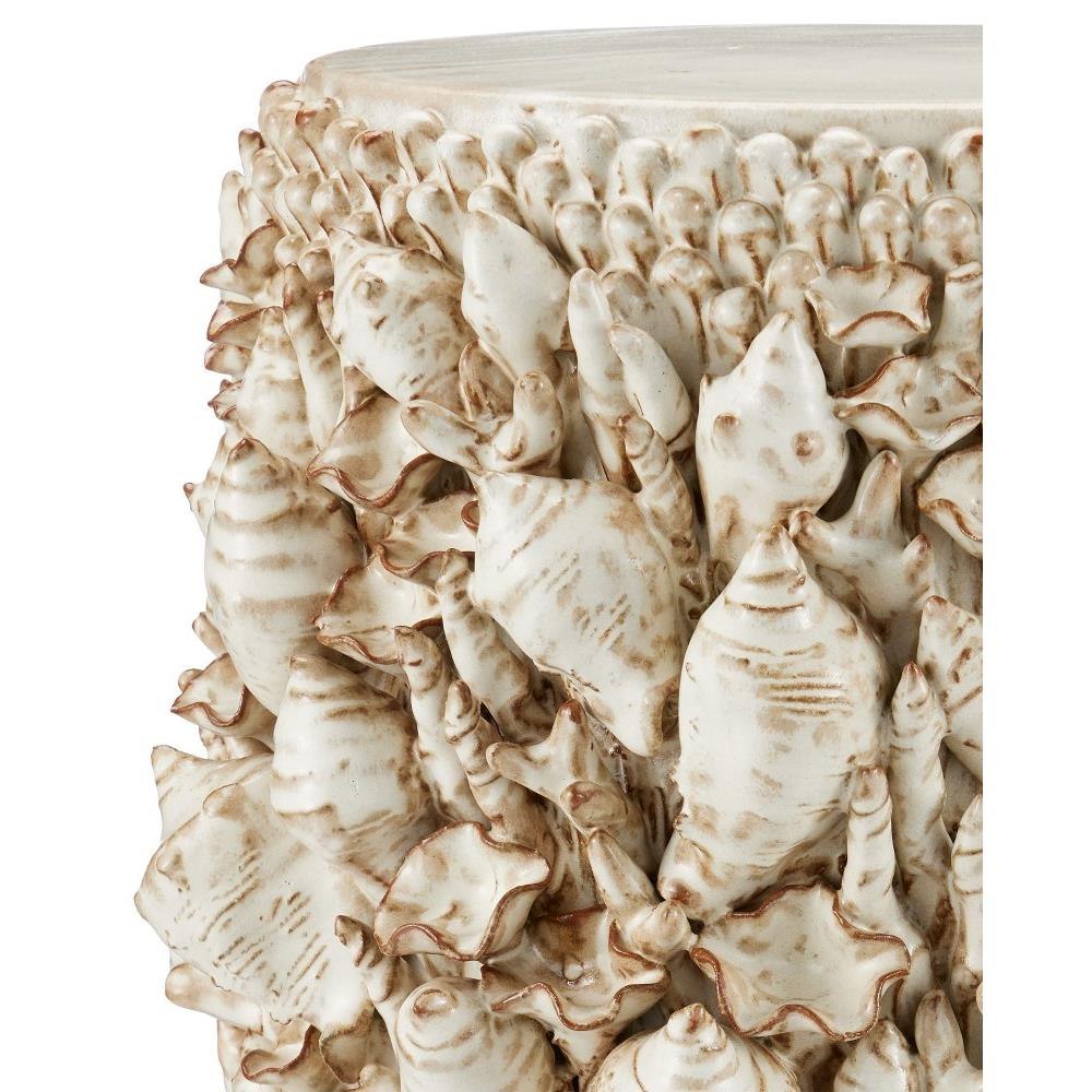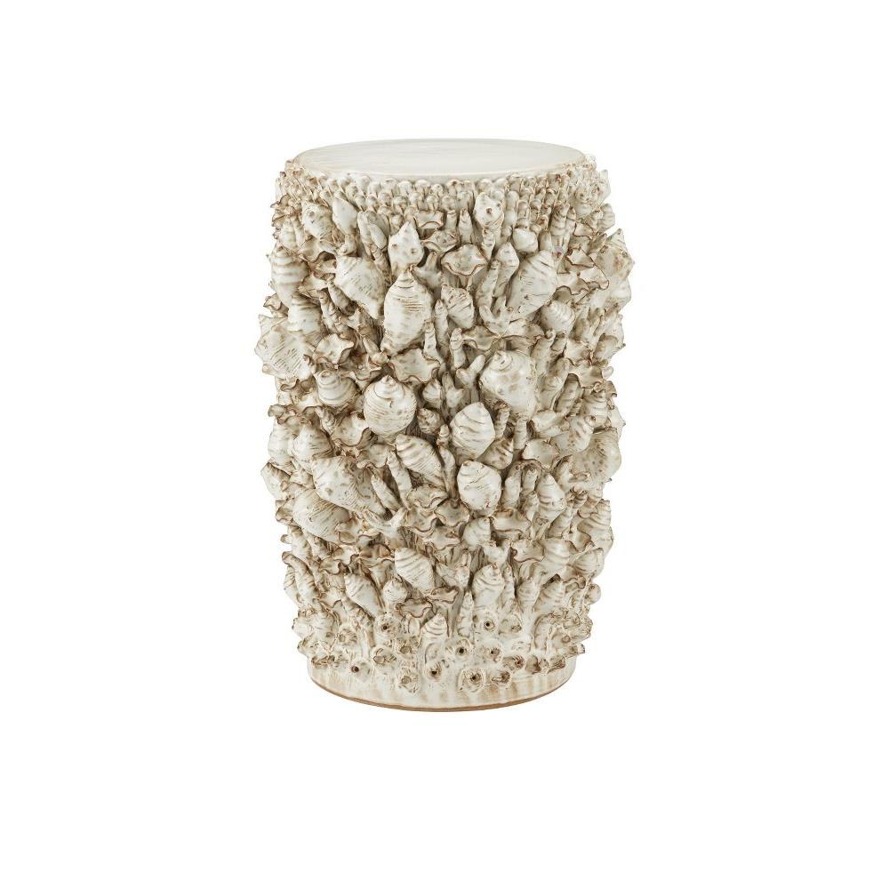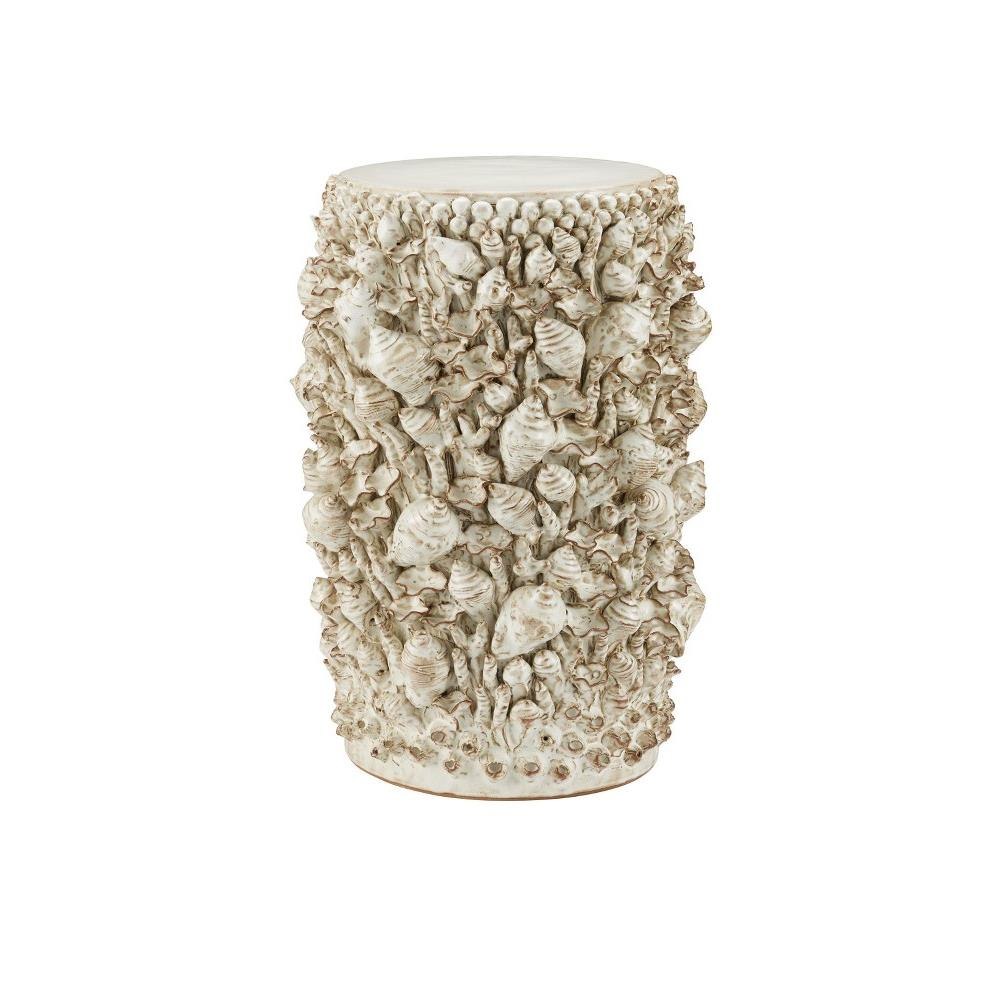 Though the Corfu Ivory Accent Table looks as if it is covered with lovely shells, the intricate shapes are actually handmade of ceramic. The table, which is also ceramic, has a round pedestal body that is shaped before it is covered with each of the shells, one at a time, by hand. This is a painstaking process. To complete the illusion that it is covered with sea-life, the surface has barnacle shapes on its top and bottom.