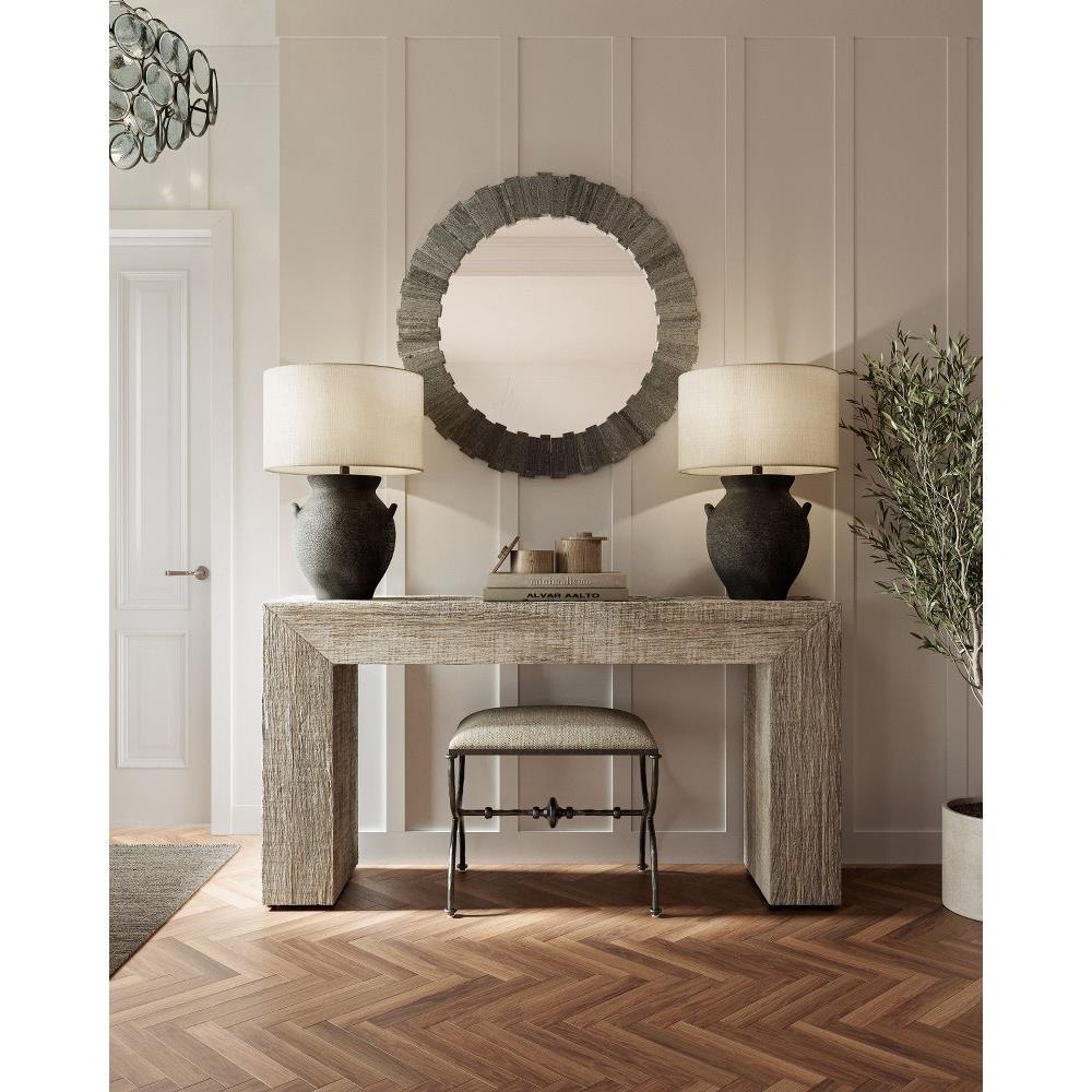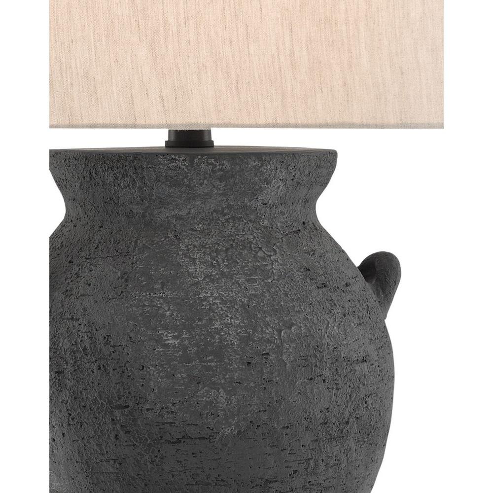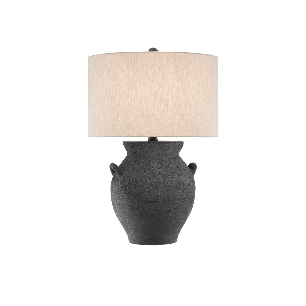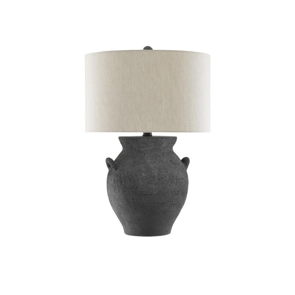 Made of terracotta in a black ash finish, the Anza Table Lamp mimics a ginger jar shape with cleverly placed handles. The roughness of the surface of the terracotta gives this dark gray lamp an extra dose of texture. Wrought iron hardware in a satin black finish is a seamless addition, as is the matching terracotta finial that fastens the natural linen drum shade to the lamp.