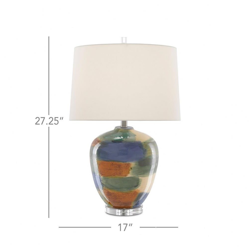 With a surface that only an artisan could create, our Rainbow Table Lamp is made of porcelain onto which swaths of blue, green, sand, and rust hues have been applied. Sitting atop a clear optic crystal base, the multi-colored lamp is fitted with an ivory shantung shade. .
